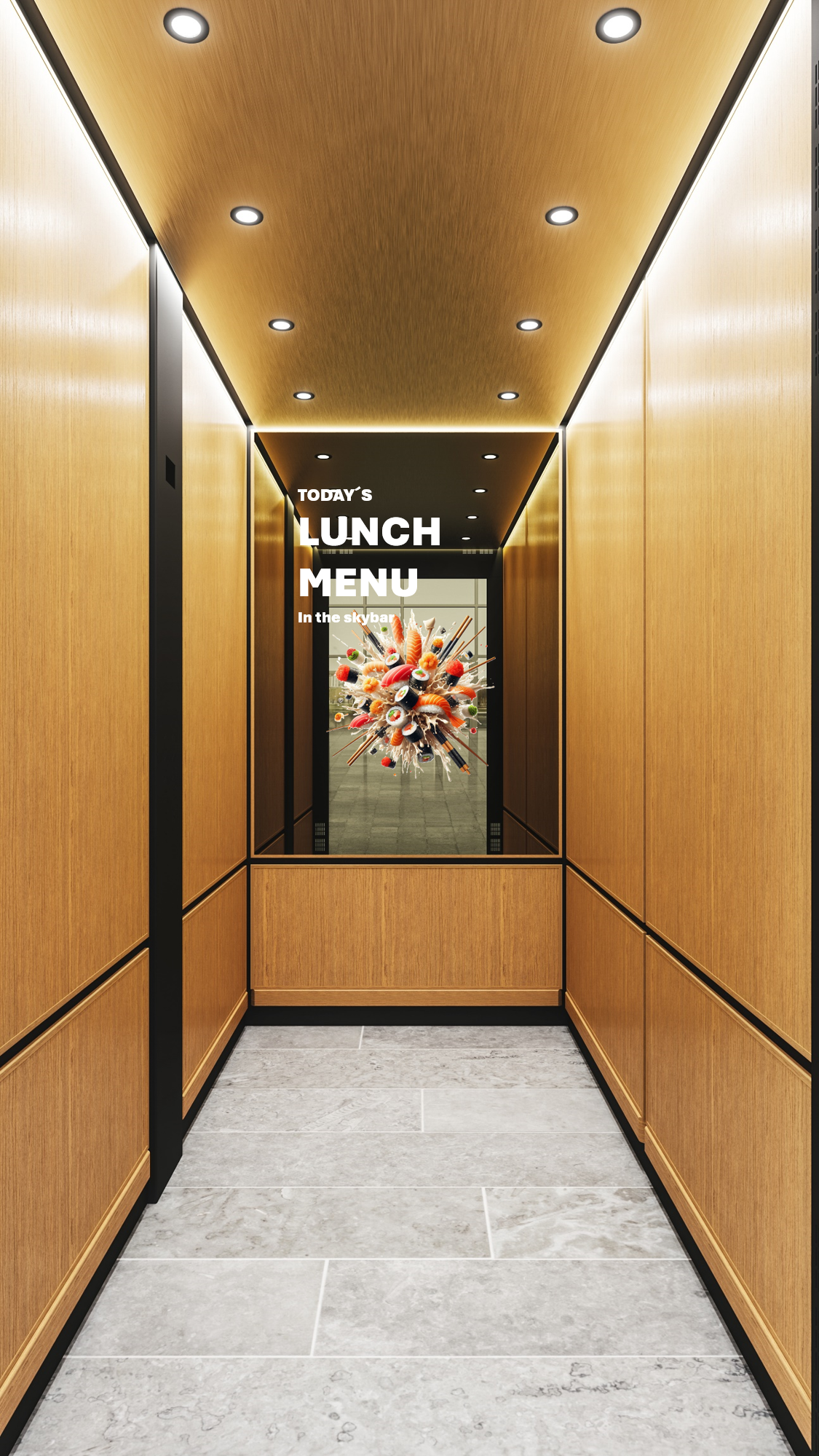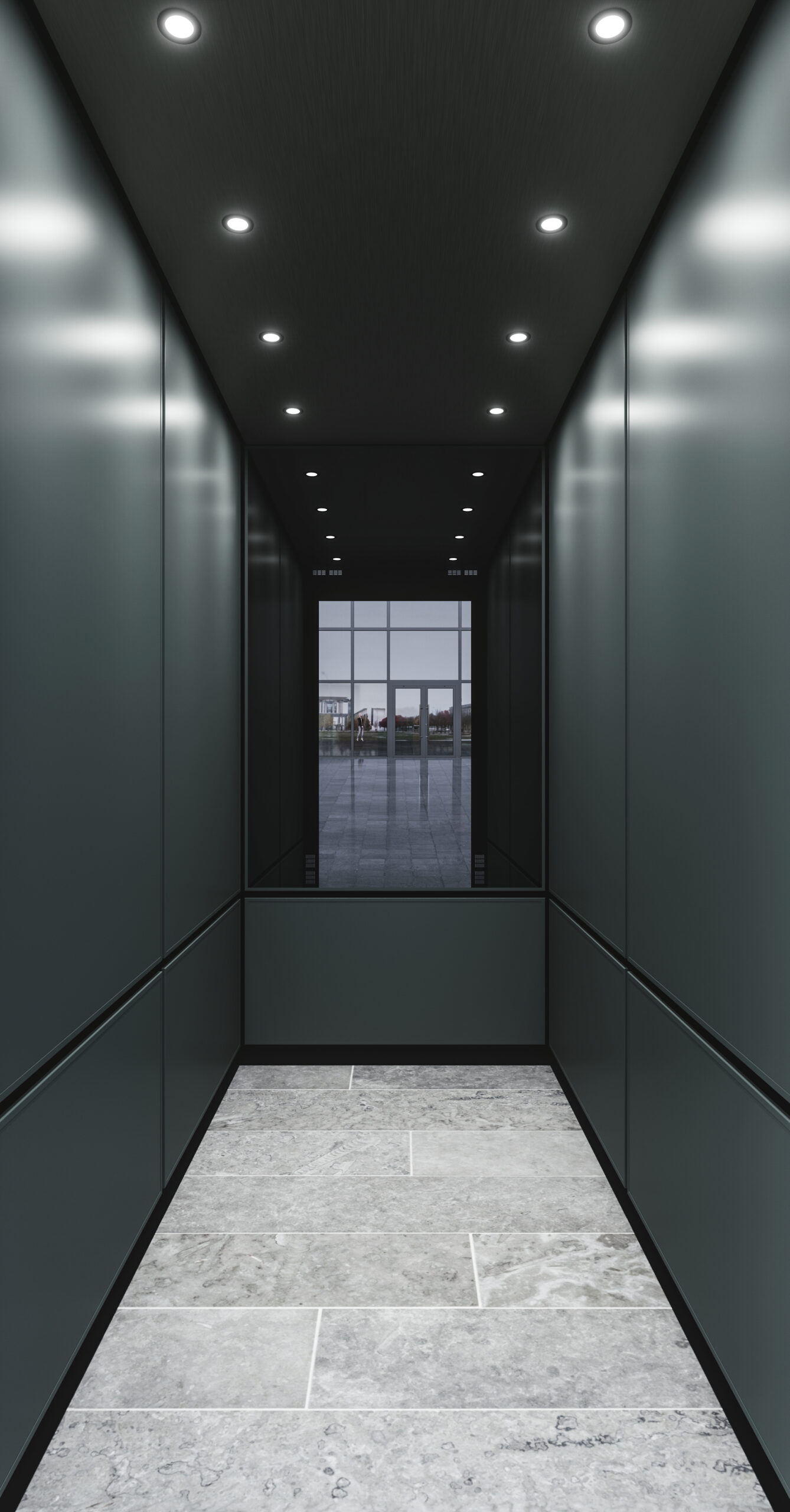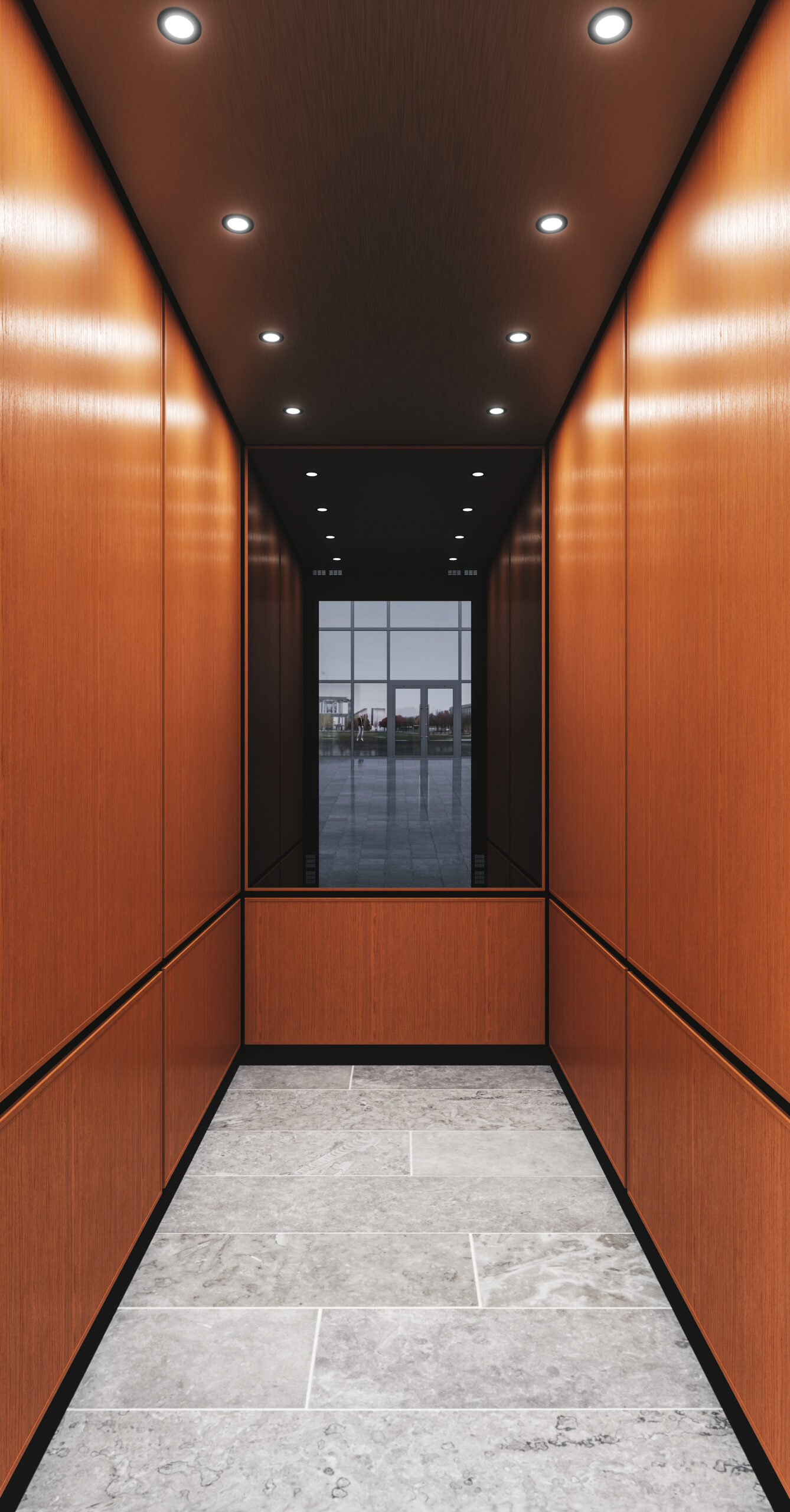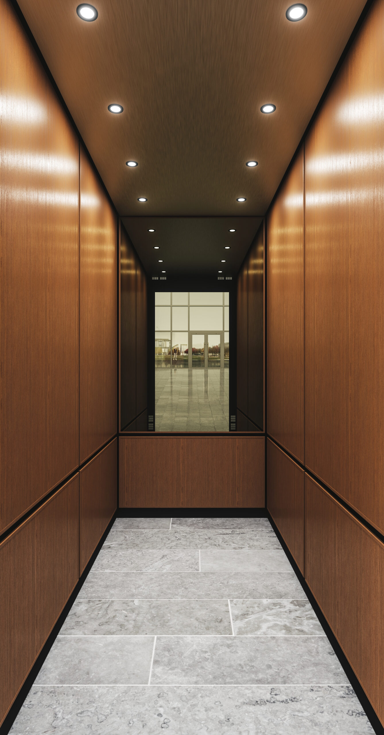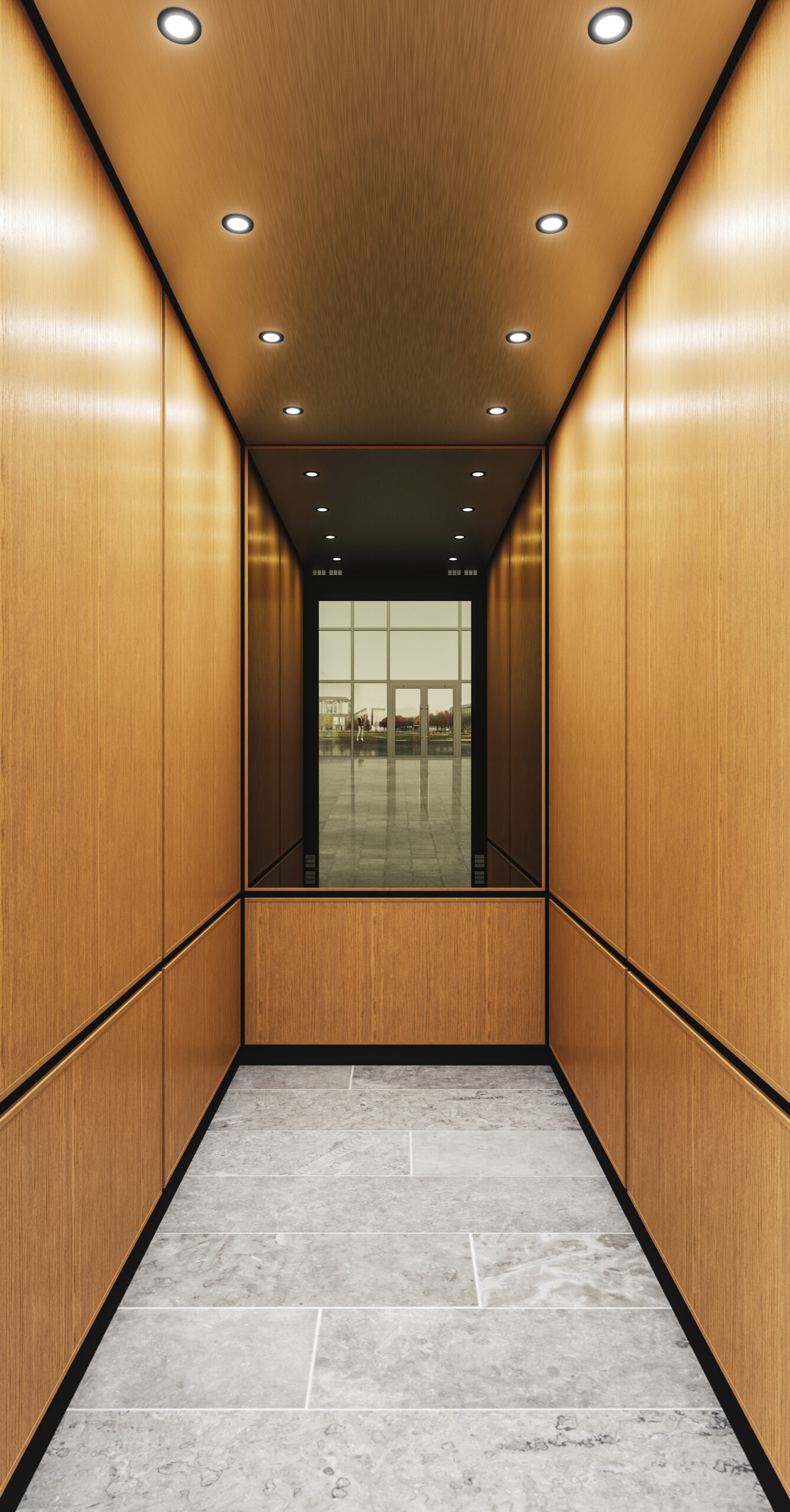 Grand är en hissinteriör med vertikalt fanerade paneler som är kantad med elegant massiv ek. Kontrasterad med ett färgat ståltak och naturstensgolv. Lämplig för exklusiva bostäder, kontor och hotell med höga krav på design och utförande.
