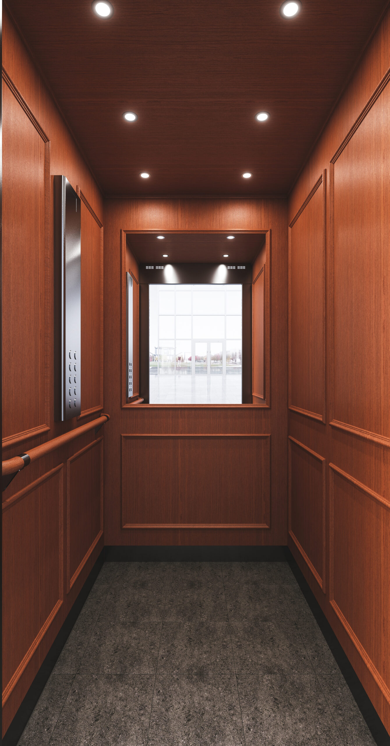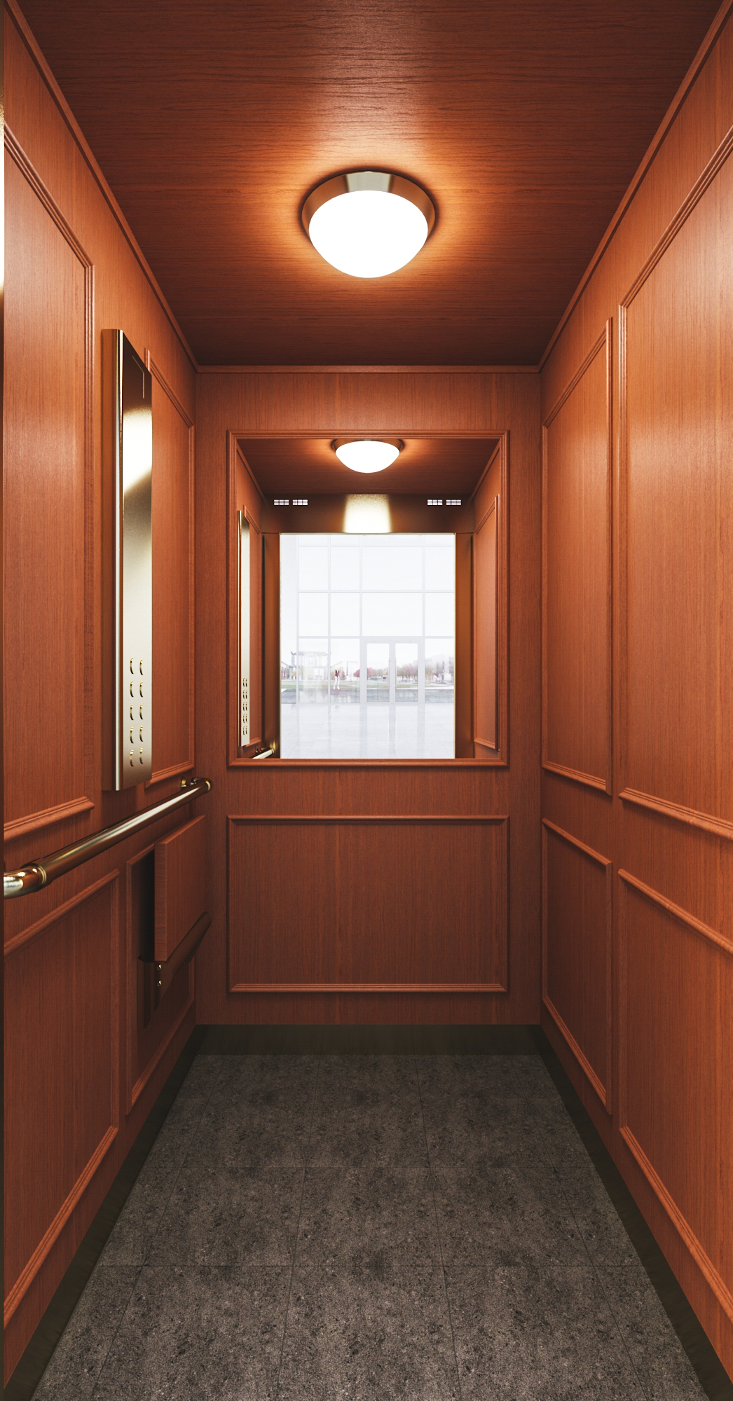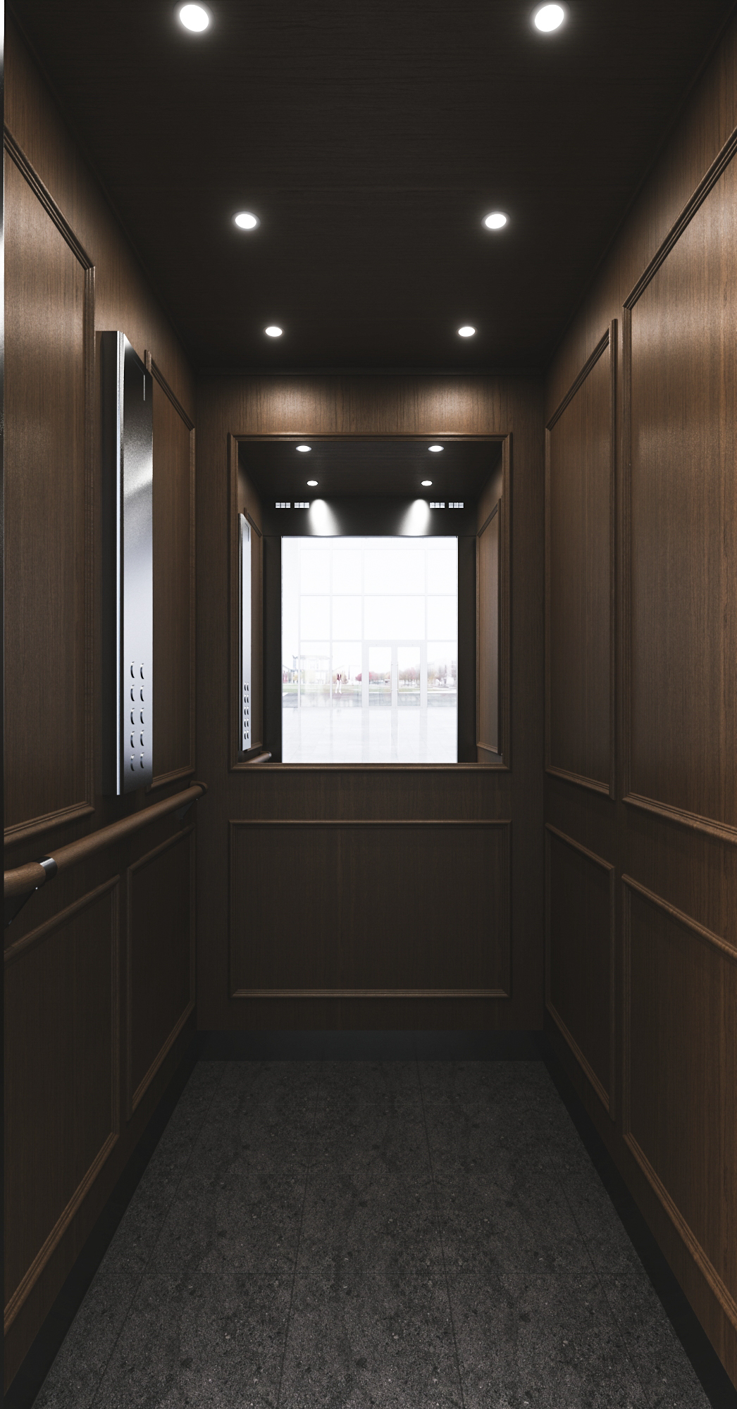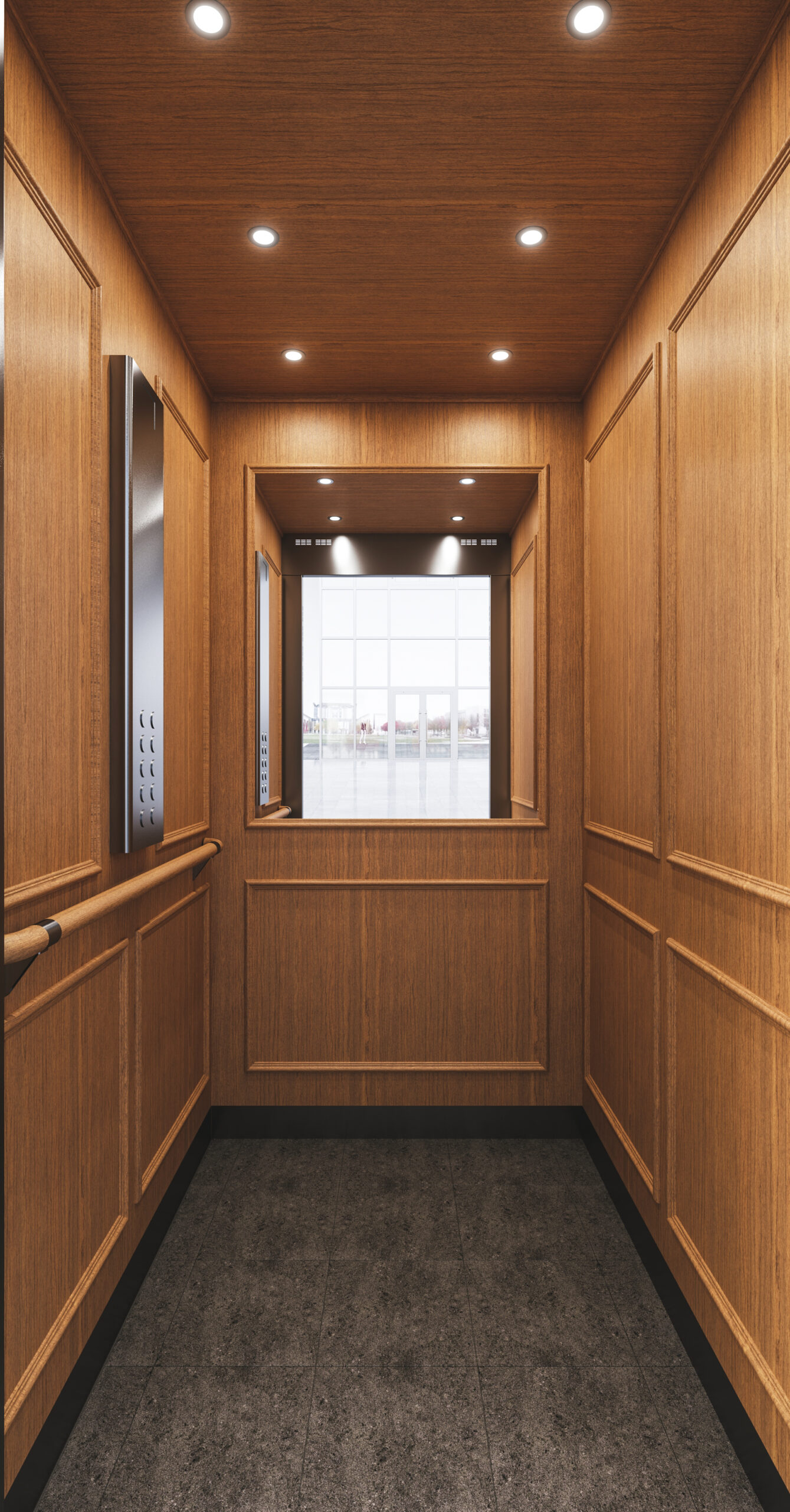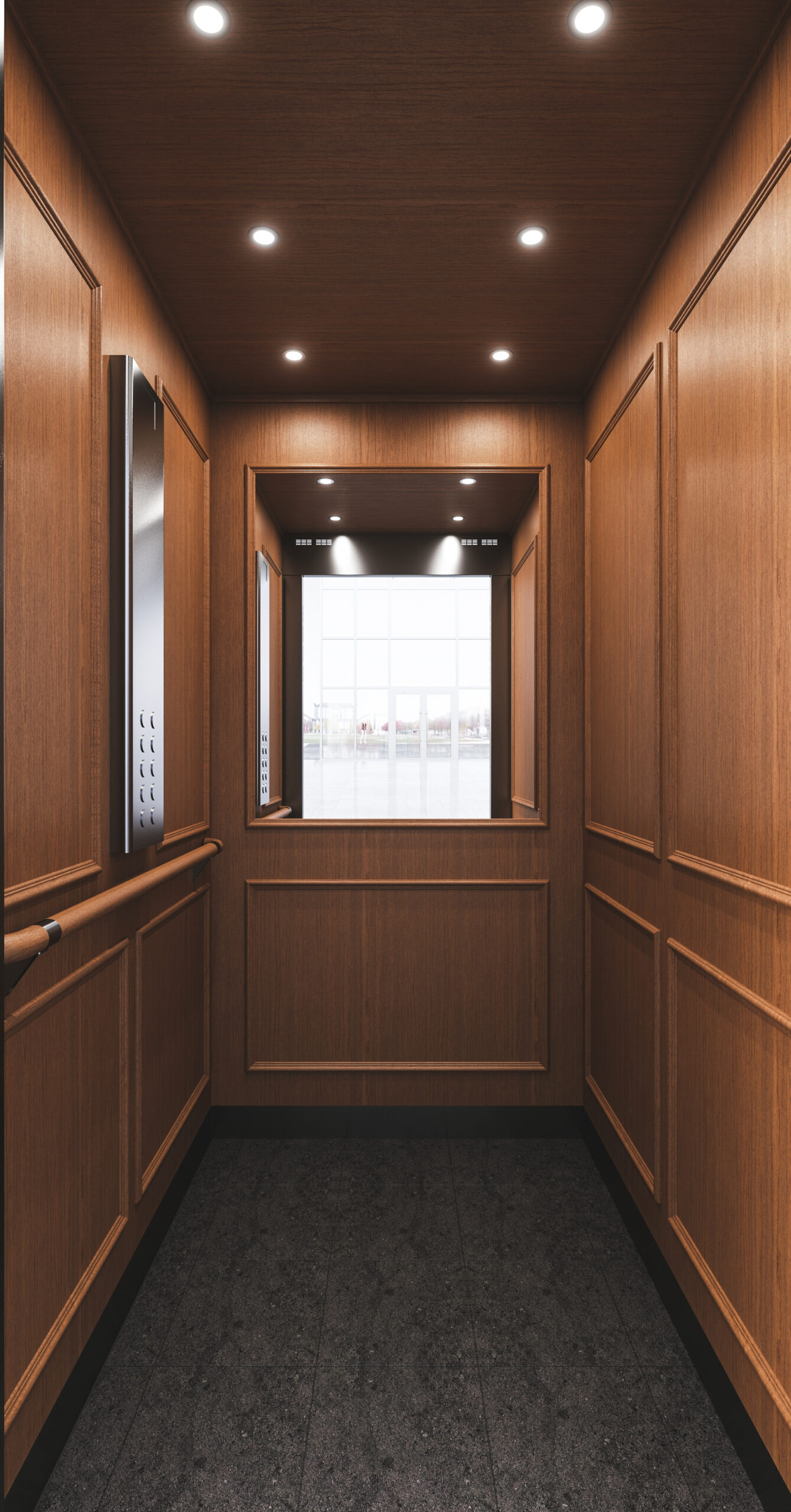 Släta fanérade väggpaneler med utanpåliggande listverk.